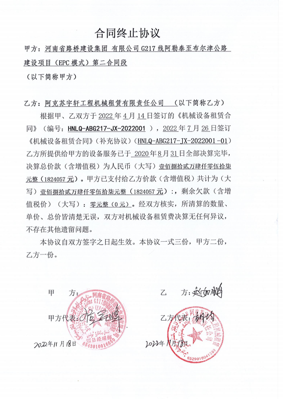 阿勒泰項(xiàng)目機(jī)械設(shè)備合同終止協(xié)議